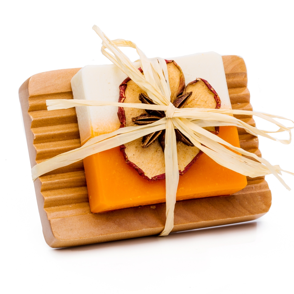 Produktinformation "Apfel – Zimt – Orangen Seife mit Holzseifenschale"