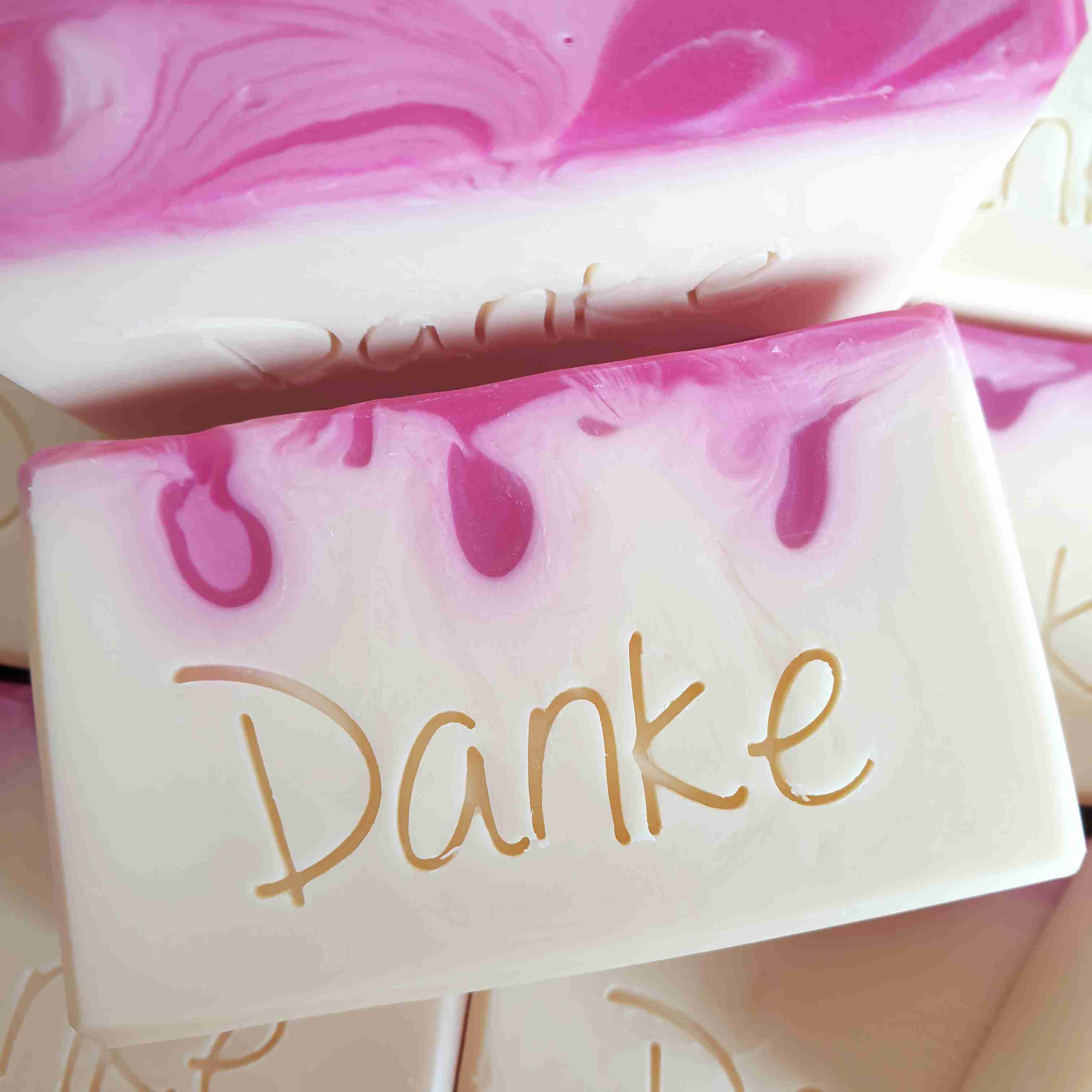 Seifenstück in weiß mit hellblauen Tropfen in dem das Wort Danke eingestempelt ist.